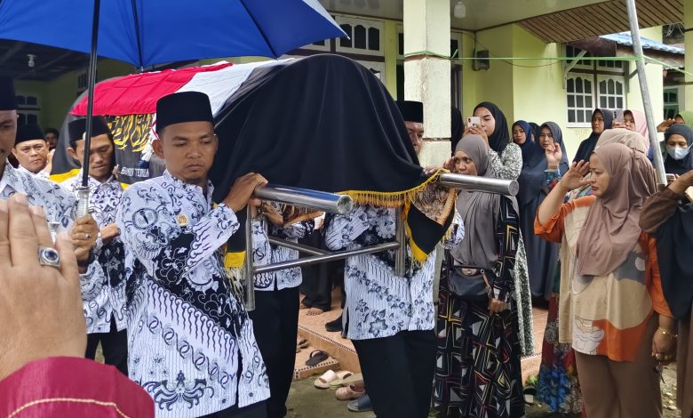 Sebagai bentuk penghargaan atas dedikasi almarhum semasa hidup, Satuan Tugas (Satgas) PGRI Kabupaten Indragiri Hilir (Inhil) berkalobrasi Satgas PGRI Tembilahan menggelar prosesi upacara pelepasan jenazah secara organisasi.