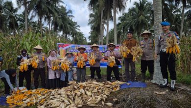 Dukung Ketahanan Pangan, Kapolsek Pelangiran Bersama Kades Panen Jagung Kuartal IV di Baung Rejo Jaya