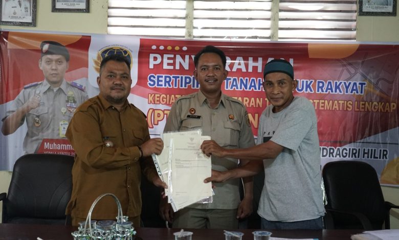 Sungai Batang – Kantor Pertanahan Kabupaten Indragiri Hilir (Kantah Inhil) menyerahkan sebanyak 100 Sertipikat Hak Atas Tanah (SHAT) elektronik kepada masyarakat Desa Pasenggrahan, Kecamatan Sungai Batang, pada Senin, 15 Desember 2025.