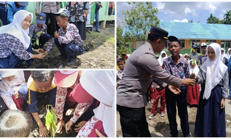 Pelangiran, — Dalam rangka mendukung program Green Policing dan menumbuhkan kesadaran peduli lingkungan sejak dini, Polsek Pelangiran bersama majelis guru SDN 002 Simpang Kateman serta SMPN Satu Atap Simpang Kateman melaksanakan kegiatan Police Go to School sekaligus penanaman pohon di halaman sekolah, Kamis (16/10/2025) pagi.