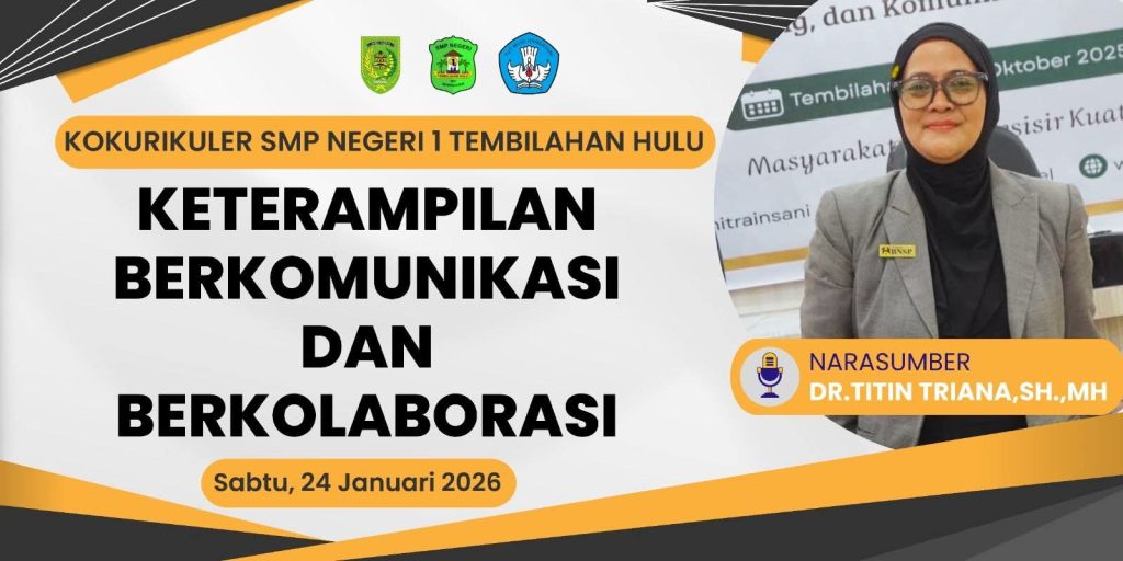 Tembilahan Hulu, Selasa 27 Januari 2026 SMP 1 Tembilahan Hulu baru-baru ini menggelar kegiatan kokurikuler yang menghadirkan narasumber Dr. Titin Triana, SH., MH. Kegiatan ini mengangkat tema penting bertajuk “Ketrampilan Berkomunikasi dan Berkolaborasi”, yang dihadiri oleh seluruh siswa dan staf pengajar.