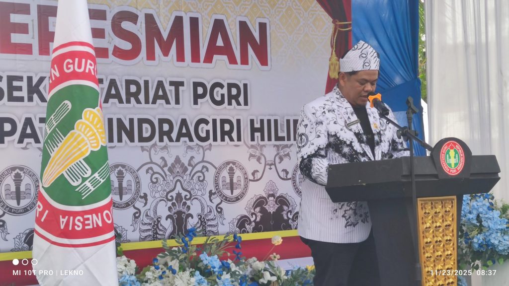 Tembilahan, 23 November 2025 – Bupati Indragiri Hilir, H. Herman, SE., MT, meresmikan Sekretariat dan Rumah Singgah Pengurus Persatuan Guru Republik Indonesia (PGRI) Kabupaten Indragiri Hilir pada Minggu pagi, 23 November 2025, yang bertempat di Jalan Kritang, Tembilahan. Acara peresmian ini dihadiri oleh berbagai tokoh penting di Kabupaten Inhil, termasuk Bunda PAUD Kabupaten Indragiri Hilir, Hj. Katerina Susanti, SKM., M.Kes, yang juga merupakan Ketua PMI Kabupaten Inhil dan Ketua UKM Kabupaten Inhil, serta Bapak/Ibu Unsur Forkopimda, Anggota DPRD Kabupaten Inhil Bapak Said Abdul Aziz yang juga seorang Pejuang Subuh, Kepala Dinas Pendidikan Abdul Rasyid, se, MM beserta Pejabat Eselon 3 dan 4, Kepala Kementerian Agama Kabupaten Inhil, dan seluruh Camat se-Kabupaten Indragiri Hilir.