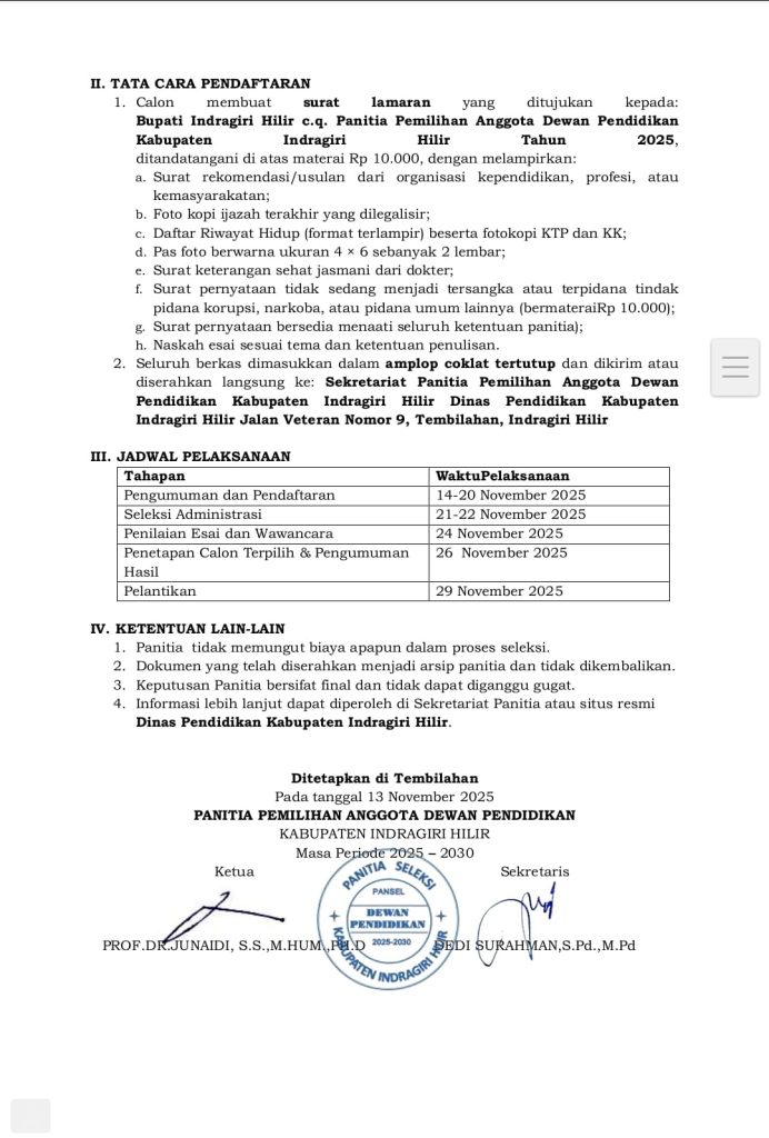 Pengumuman ini menjadi penanda dibukanya pendaftaran bagi masyarakat Inhil yang peduli dan ingin berkontribusi dalam memajukan dunia pendidikan di Kabupaten Inhil mulai dari tanggal 14 sampai 20 November 2025.