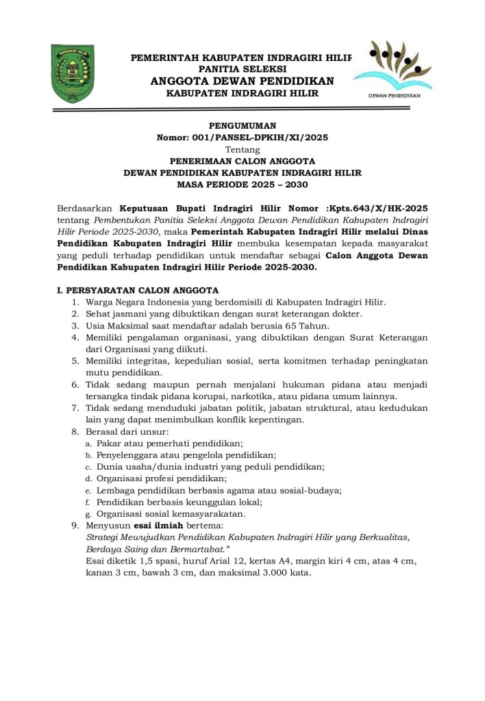 TEMBILAHAN – Tahapan seleksi calon anggota Dewan Pendidikan Kabupaten Indragiri Hilir (Inhil) untuk periode 2025-2030 memasuki babak penting. Panitia Seleksi (Pansel) Dewan Pendidikan Inhil secara resmi telah mengumumkan kriteria dan persyaratan yang harus dipenuhi oleh para calon anggota.