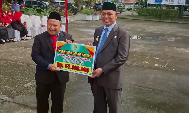 TEMBILAHAN – Kepedulian terhadap sesama ditunjukkan oleh keluarga besar Dinas Pendidikan (Disdik) Kabupaten Indragiri Hilir (Inhil). Dipimpin langsung oleh Kepala Dinas Pendidikan, Abdul Rasyid, SE., M.Si, donasi sebesar Rp57.382.000 diserahkan kepada Bupati Inhil secara simbolis di usai upacara bela negara dikantor Bupati, Jumat(19/12) untuk membantu korban bencana alam di wilayah Sumatera.